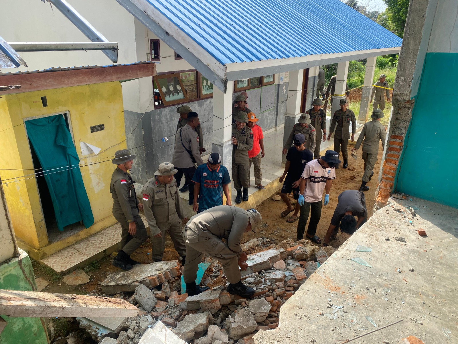 Kegiatan ini melibatkan personel dari Pos Kamtibmas Tamanjeka serta Tim Alfa 1 dan Alfa 2, yang secara bersama-sama membersihkan reruntuhan bangunan, termasuk meja dan kursi yang terdampak gempa.