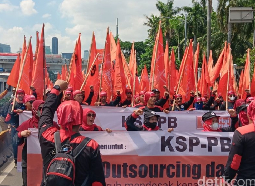 Jakarta – Ribuan buruh yang tergabung dalam Partai Buruh dan Konfederasi Serikat Pekerja Indonesia (KSPI) menggelar aksi unjuk rasa di depan depan Gedung DPR/MPR Senayan, Jakarta, menuntut kenaikan upah tinggi tahun depan dan penghapusan pajak tunjangan hari raya (THR).