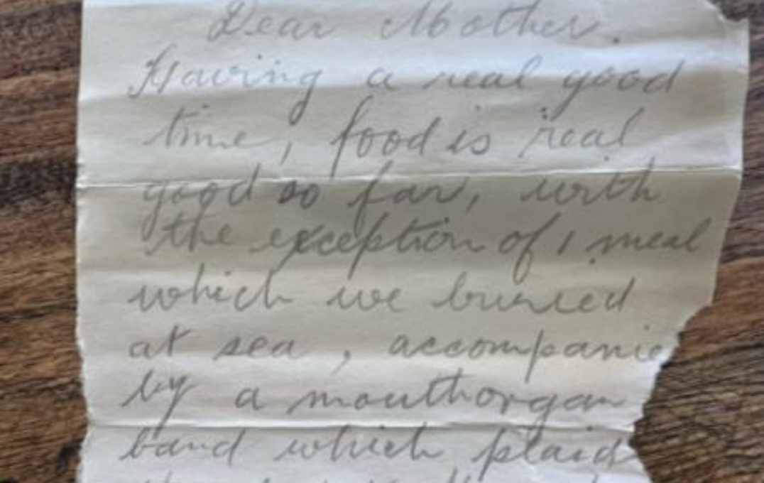 Sementara Neville menulis kepada ibunya, Robertina Neville, di Wilkawatt, Australia Selatan. “Kami bersenang-senang, makanannya enak sejauh ini, kecuali satu hidangan yang kami kubur di laut,” tulisnya.