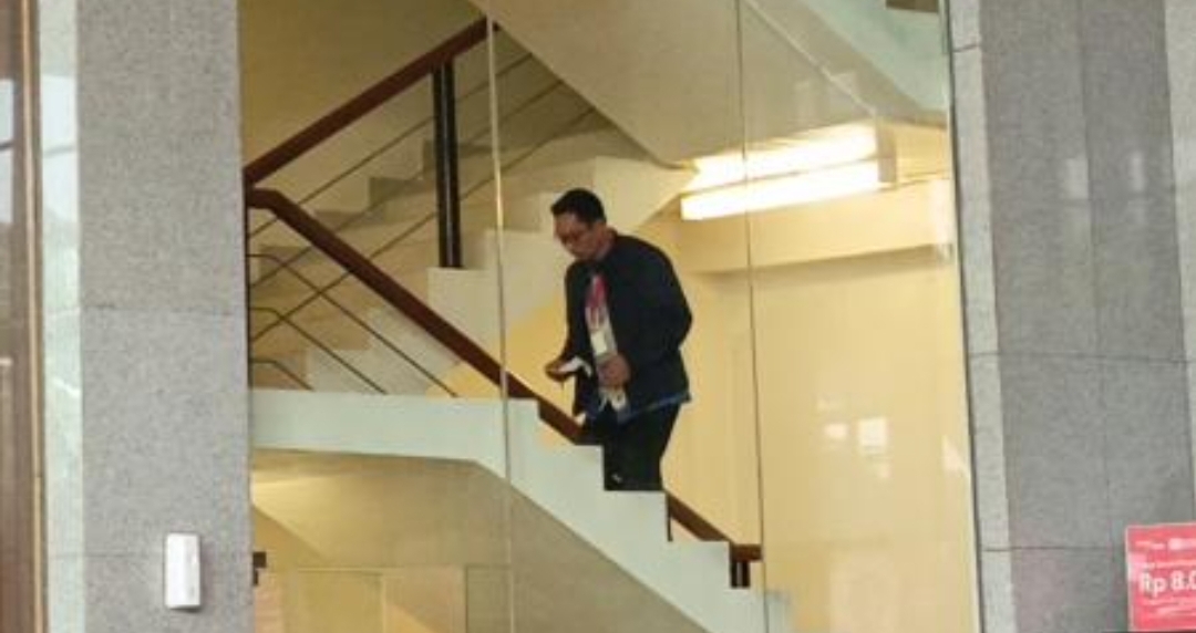 Setelah memakai lanyard merah khas saksi di KPK, Ridwan Kamil segera beranjak ke lantai dua gedung yang merupakan tempat pemeriksaan.. **/ iNews