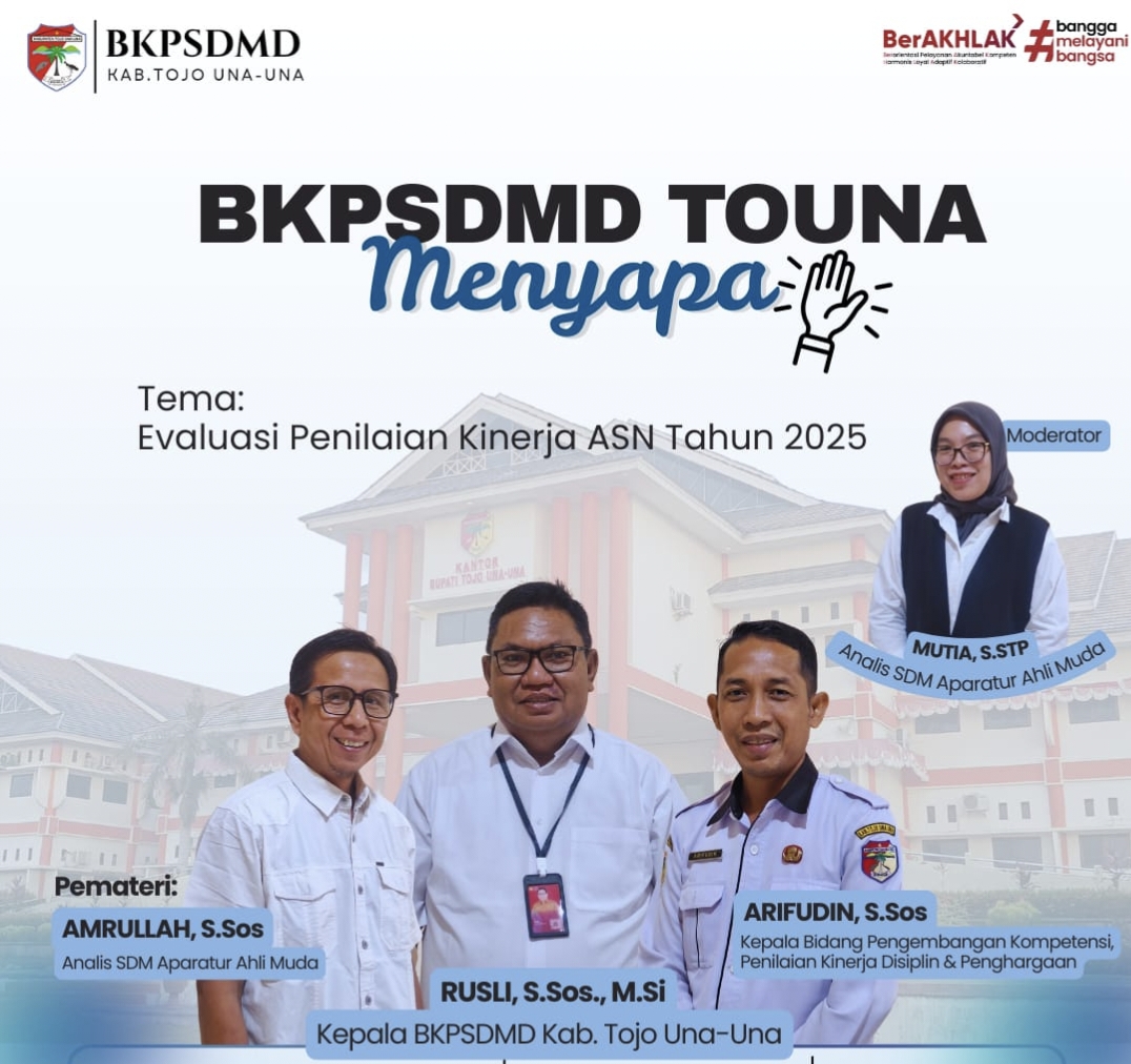 Program “BKPSDMD Touna Menyapa ASN” diwujudkan melalui kegiatan virtual perdana dengan tema”Evaluasi Penilaian Kinerja ASN Tahun 2025”.