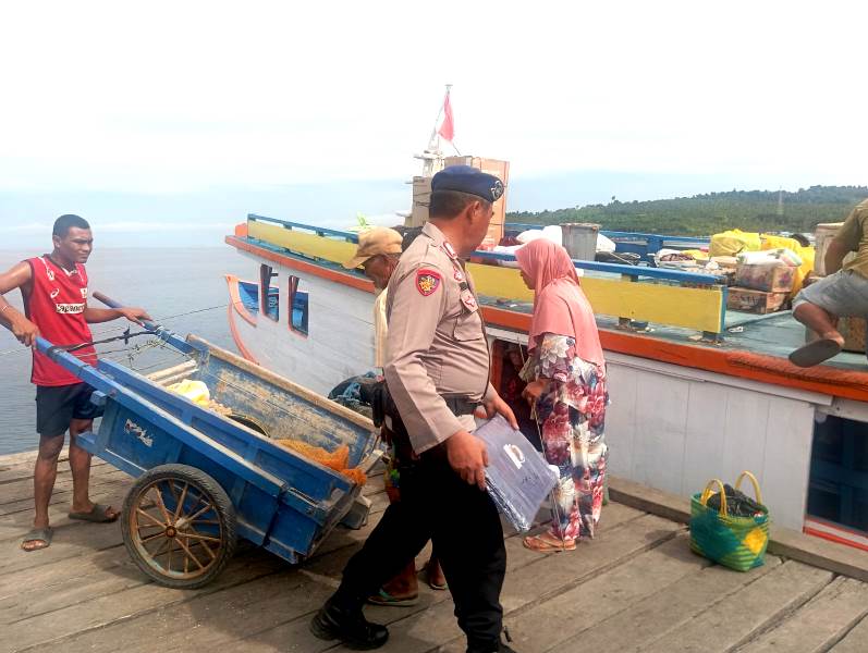 Selain memberikan imbauan teknis, personel Satpolairud di bawah pimpinan Ps. Kanit Patroli Bripka Febio Prangky Suakang juga turun langsung membantu warga menaikkan barang bawaan ke atas dek kapal.
