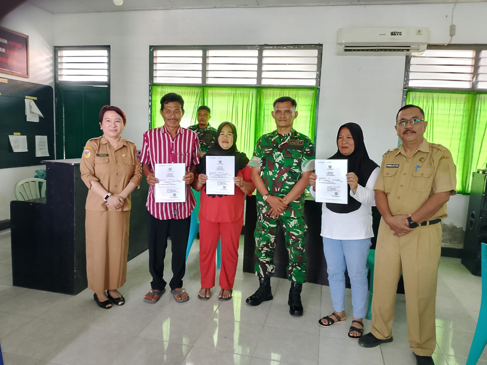 Warga masyarakat bersama Danramil 1307-05 Ratolindo, Kapten C.Ke, Risman dan Sekretaris Dukcapil Hasbullah DM saat foto bersama sambil menunjukan akte kelahiran yang telah selesai dibuat diruang kerja kantor Koramil setempat, Senin (9/2/2026)