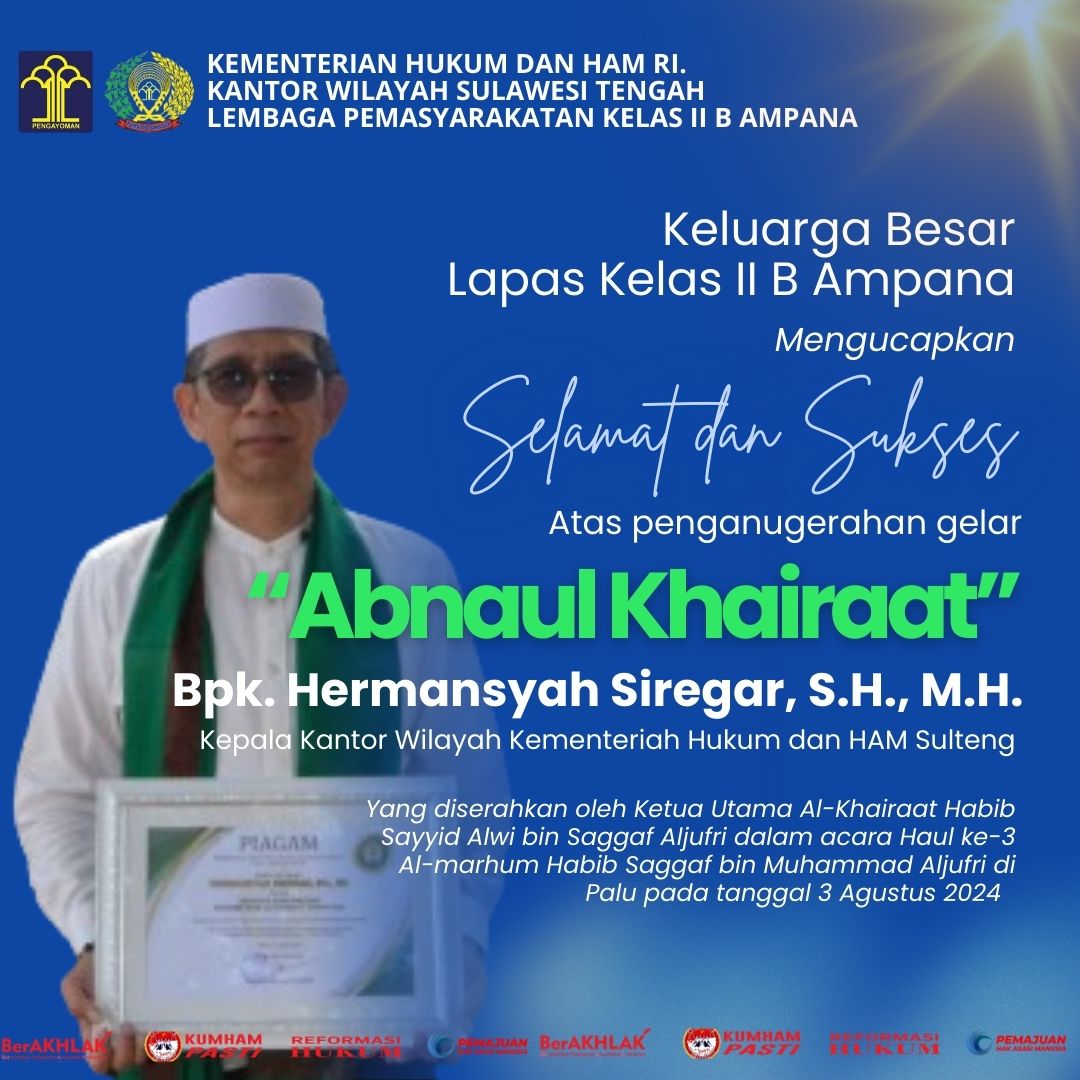 Keluarga Besar Lapas Kelas IIB Ampana Mengucapkan Selamat dan Sukses Kepada Kakanwil Kemenkumham Sulteng Atas Penganugerahan Gelar Abnaulkhairaat